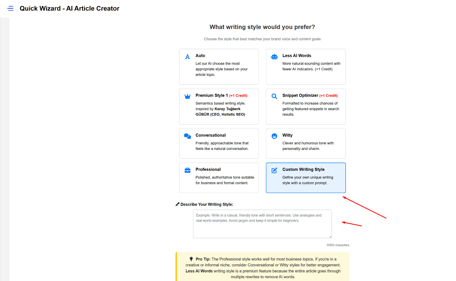 You can now use Custom writing styles while generating an article in Quick modes and Godlike modes.